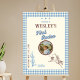 First rodeo, wild west 1st birthday party welcome poster sign. Rustic dusty blue plaid, desert cactus design complete with horse riding cowboy. 1st birthday boys cowboy birthday party poster welcome sign has vintage cream, browns and blue colors and photo template. Perfect for a wild west birthday party aesthetic. Customize with your information. Matching party supplies, invitations and signs are available in the First Rodeo Blue Buffalo Plaid 1st Birthday Collection in The Gathering Designs store.
