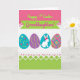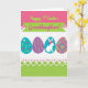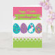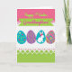 Designed with a bright spring palette, this card features a large fuchsia panel at the top with a lime-green greeting centered in flowing lettering. Just below, a lime-green banner carries a fuchsia message in thick, easy-to-read type, giving the layout a sweet, together feel. Four decorated egg-shaped ovals sit across a white background, each with its own pattern and color story. One egg is teal with wavy lime lines and small pink-and-white blossoms, like a gentle nod to new flowers and shared smiles 🌷. Another is deep purple with similar lime curves, adding a cozy contrast beside it. A third teal egg shows a soft, long-eared bunny with a small pink bow and a rounded tail, its calm expression suggesting a tender bond 🐰. Along the bottom, a light-green band is filled with interlocking white geometric shapes and sprinkled with tiny red dots.