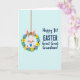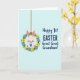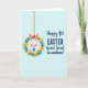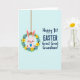 This card features a light pink long-eared bunny centered inside a circular wreath of yellow and blue flowers with green leaves, hanging from a simple cord, with a gentle springtime look 🌷. The bunny’s wide dark eyes, tiny red nose, and softly blushed cheeks give it a sweet, friendly presence, like it’s gazing out with quiet affection 🐰. A bright blue bib-like shape sits on its chest, adding a strong color accent against the pale pink fur. The background is an even sky-blue field that keeps the scene calm and airy. On the right side, a large dark blue message is arranged in flowing lettering, taking up most of the open space beside the wreath. Smaller supporting words sit near it in the same dark blue, aligned neatly to read as a first-year spring holiday greeting. The floral ring shows rounded petals in sunny yellow and cool blue, with leaf clusters tucked between blossoms and a thin hanging cord drawn above.
