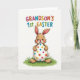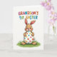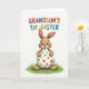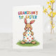 This card shows a cute, human-like bunny in soft warm brown, with pink inside its upright ears and a faint blush on its cheeks 🐰. Its wide dark eyes and open smile give it a friendly look, like it’s sharing a sweet moment with whoever receives the card. The bunny’s small rounded paws cradle a large white egg, held close as if it’s a treasured gift between friends. The egg is covered in neat round polka dots in red, blue, yellow, green, and bright pink, scattered across the smooth surface for a lively pattern 🌷. The bunny stands on a small patch of green grass with gentle shading to suggest texture. The background stays plain white, keeping all the attention on the character and the colorful egg. Near the top, a short line of text announces a “first” Easter, with each letter in a different color. The grass sits directly under the bunny, forming a simple base beneath the centered figure.