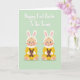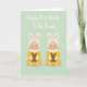 This card features a calm pastel green background that sets a gentle springtime scene. Two nearly identical cartoon-style infants sit side by side across the lower half, angled slightly toward each other with matching rosy cheeks and small crescent smiles that feel sweetly affectionate. They wear bright yellow one-piece outfits and soft bunny-eared hats with pink inner lining, adding a cozy seasonal touch 🐰. In each child’s hands is a small dark brown plush bunny with long upright ears, as if they’re sharing the same comforting companion 🐇. Above them, a congratulatory greeting about a first spring holiday appears centered near the top in flowing white lettering with a faint shadow for depth. The open space around the words keeps the focus on the pair below while the pale background stays smooth and uncluttered. The twins’ dot eyes, blush cheeks, and mirrored poses create a quiet sense of closeness. The yellow outfits sit in warm contrast against the soft green backdrop, with pink ear details repeating in both hats.