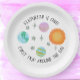 Paper plates with a pink planet First Trip Around The Sun theme for girl's 1st birthday parties. These coordinate with the other outer space themed decor for celestial galaxy parties, and they have the sun, stars, earth, and some watercolor planets. Search for "first trip" in my shop to find the coordinating items.