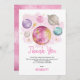 Thank your guests with this magical outer space themed thank you card. Featuring imaginary planets, moon and stars in pink, purple, navy and gold colorway.