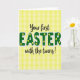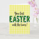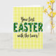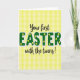 This card features a centered milestone message, arranged in a balanced layout that feels cozy and close, like a shared family moment 🌷. The main word sits in the middle in large emerald-green letters with a white outline, standing out clearly against the background. Small yellow egg-shaped accents with thin stripes rest on and around the letters, adding a springtime touch 🐰. Above the main word, the phrase “Your first” appears in smaller dark gray lettering, placed in a gentle curve that leans into the center. Below, “with the twins!” is set in matching dark gray text, spaced neatly to mirror the line above and frame the focal word. The background is a soft pastel yellow with a subtle gingham-style check pattern, giving the scene a homey setting where closeness and affection feel quietly present. The overall palette stays light and sunny, with the green and yellow elements drawing the eye while the dark text keeps the message easy to read. The white-outlined green letters sit atop the pale yellow checkered backdrop, with the striped yellow ovals dotted like tiny decorations across the center.