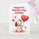 This greeting card shows a cream-colored cartoon puppy with chocolate-brown spots sitting on a white background, eyes closed and smiling with rosy cheeks 🥰. It has a red collar with a tiny gold charm, which makes it feel cared for and special. The puppy is holding a large shiny red heart balloon that floats upward, drawing your attention to the message above. At the top, the text reads “Happy First Valentine’s Day Grandson” in red, rounded letters that stand out clearly against the white space. Small hearts in red and soft pink are scattered around the puppy and balloon, like little love notes drifting through the air ❤️. The simple setting keeps the focus on the sweet expression and the heart, making the card feel gentle and affectionate. It’s a meaningful way to celebrate a first Valentine’s Day with a grandson and show love in a friendly, family way.
