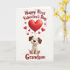 This greeting card shows a sweet cartoon puppy sitting on a plain white background, looking completely content with its eyes closed and a big smile 🥰. The puppy has soft cream fur, floppy brown ears, and a simple rounded shape that makes it feel gentle and friendly. Above the puppy floats a large red heart balloon with a shiny look, tied to the puppy by a thin string. Several smaller red heart balloons drift around it, filling the space with a cozy Valentine’s Day feeling ❤️. At the top, the words “Happy First Valentine’s Day” appear in red cursive-style lettering, arched over the balloons. Near the bottom, the word “Grandson” is written in matching red letters, placed below the puppy. The light shading on the hearts and a small shadow under the puppy add depth without distracting from the message. It feels meaningful to give because it pairs a happy little character with a clear message of love for a first Valentine’s Day, making it easy to share Valentine’s Day sentiments.