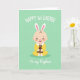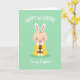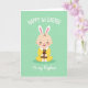 This card shows a cheerful infant centered on a pastel mint-green background, smiling wide with eyes gently crinkled as if sharing a sweet moment with someone close. Soft white bunny ears with light pink inner details sit on the child’s head, adding a spring touch 🐰. The baby’s round features and rosy cheeks are drawn with smooth shading, and the sunny yellow outfit is finished with a white scalloped collar. Tiny hands hold a small dark-brown plush creature close to the chest, like a cozy companion in a tender family scene. Near the top, a large white message is placed in flowing lettering to mark a first-year milestone. Along the bottom, a smaller white line of cursive-style text sits neatly under the figure, reinforcing the family connection without crowding the art 🌷. The background stays uncluttered so the gentle smile, pink ear accents, and the little plush toy stand out against the mint field.