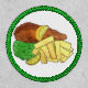 Patch features an original marker illustration of a British pub classic: fish and chips with mushy peas, served with tartar sauce and a wedge of lemon.