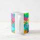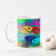 This mug has a design of a school of fish in green, blue, orange, yellow, red, pink, and blue-green swimming in the ocean.