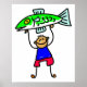 Cute cartoon whimsical illustration of a happy little stick figure boy holding up the large fish he has caught whilst out fishing. Easily customize and choose your own background colour or add text. Image available on various gifts and products.