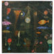 In Fish Magic, Paul Klee creates a magical realm where the aquatic, the celestial, and the earthly intermingle. A delicate black surface covers an under layer of colors, which the artist revealed by scratching and scrawling designs in the black paint. At the center of the painting, a square of muslin is glued onto the canvas. A long diagonal line reaching to the top of the clock tower is poised as if to whisk off this subtle curtain.