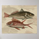 Antique fish engraving of red perch, or redfish - This fishing gift is based on an early colored engraving by Mark Catesby (British, 1679-1749). The beautiful fish engraving is from "The Natural History of Carolina, Florida and the Bahama Islands", London, 1754 edition. The vintage fish engraving is titled "Perca rubra & C". The red perch is a common name of fish that refers to several species of fish. The Percua is actually the common Perch, a wonderful little game fish, generally living in fresh water. The saltwater dwelling red drum is also often referred to as a redfish or red perch. The vintage fish image of red perch shows two fish swimming past each other, the bottom fish is red while the top perch is gray and red. In many of our red perch fish gifts, there is a background showing light images of fish swimming by, and capped with a touch of calligraphy that talks about red perch.