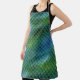 Great color and even though I ordered the kid size, it covers well enough to use during the holidays. I am not a big woman and prefer a shorter apron. I stand 5"6" and the length of the garment goes to mid-thigh. The tie straps fit well at my waist and even though there is no neck strap adjustment, the opening is plenty big enough. I am happy with the size and fit. I am sharing my apron with my 10 year old grandson, too! The color is vibrant and looks good, as shown on the website. The stitching looks strong and reinforced. Photographed is front side and back side of the apron, reinforced straps and coloring. My phone camera may not be the best at showing the details.