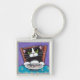 Cute cat keychain featuring artwork by Lisa Marie Robinson. A painting of a tuxedo cat sitting at a table enjoying a bowl of fish tail soup.