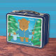 Cute kid metal lunch box featuring a cartoon brown bear holding a fishing rod in one hand and a pail full of fish he caught in the other . Choose the color you want for the box and personalize it with the name of the child .
