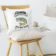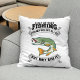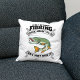 This image features a square decorative pillow with a humorous fishing-themed print. The central graphic is a vibrantly colored illustration of a fish, possibly a bass, with its mouth open, as if it were caught mid-jump. The fish is surrounded by a ribbon-like banner, which contains a witty statement divided into two parts: the top arc reads "A DAY WITHOUT FISHING," and the bottom arc concludes with "BUT WHY RISK IT." Between the arcs, the punchline "PROBABLY WOULDN'T KILL ME" bridges the message. The design employs a classic combination of fonts that evoke a vintage feel, and the colors are earthy with a touch of realism in the fish's portrayal.