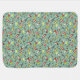 This baby blanket has fishing lure illustrations inspired by vintage fishing lures in shades of red and yellow on a pale teal background.
