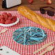 A colourful design of fishing net and bright blue rope from a boat and stored on the harbour jetty.