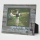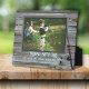 Standing photo plaque with the appearance of wood. Special memory photo gift for dad or grandpa with a fishing theme. Distressed gray-brown wood is the background for light blue text with fishing rod image. Include wording such as, "Fishing with Dad" or whatever the event may be. One more line can hold the location, occasion, and / or date of memory. Makes the perfect gift for any male member of the family.
