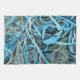 A colourful design of fishing net and bright blue rope from a boat and stored on the harbour jetty.