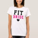 Get wedding-ready with this white tee featuring "Fit" in bold black block letters and "Bride" in hot pink with a black heart below. The back displays "Future Mrs." with a customizable last name in hot pink for a personalized monogram touch. A motivating gym shirt for brides-to-be who are crushing their pre-wedding fitness goals. Makes a great engagement gift or bachelorette party favor.