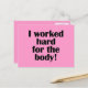 Black text fitness and exercise design reads "I Worked Hard For The Body" on fitness theme T-shirts, magnets, tote bags, cards, water bottles, stickers, mugs, buttons, key chains, and much more. Anyone who has worked hard to attain fitness and a good diet will relate to this design.