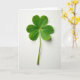 This design shows a single five-leaf clover centered on a bright white, lightly textured background, like fine paper under soft studio light. The five oval leaves fan out in a neat star shape, their greens shifting from lighter edges to deeper forest tones near the middle. Delicate veins run through each leaf, adding a gentle, intimate detail—like something two friends might lean in close to admire together 💚. A thin green stem drops straight down from the center, guiding your eye toward the lower part of the card. The greeting text sits above the clover in a soft green color, with a smaller line of text placed below in a darker green for contrast ☘️. The lighting creates a faint shadow to one side, giving the clover a slight lift from the surface. The stem ends in a freshly cut tip at the bottom, with the tiny shadow tapering off against the white texture.