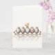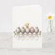 This card shows five round, plump little birds lined up in a neat row on a bright white background, their soft off‑white and light gray bodies shaded like gentle watercolor. Each one has a tiny orange beak and simple black dot eyes, and a few wear faint pink patches that read like a shy blush between friends. A smaller yellow chick sits calmly on the third bird from the left, leaning in close as if enjoying the group’s quiet company. Beneath them, a glossy reflection mirrors their shapes downward, adding a tender, dreamy touch to the scene. On both sides, thin green stems rise with small hot‑pink blossoms, like spring flowers framing the birds 🌷. The main greeting text sits above the birds in a light gray tone, spaced evenly so it feels airy and unhurried 🐇. The blossoms are clustered near the ends of the row, with bright pink petals and tiny centers that stand out against the white.