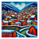 A.I .assisted print of a vibrant, surreal village within a fjord landscape is set against a starry night sky, with colorful houses blanketed in snow.