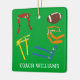 Celebrate flag football coaches and players with this custom Christmas ornament. on the front are illustrations of a football and colorful flag belts against a bright grass green background with a spot to add a name in white lettering. The reverse side has a spot to add your own photo.
