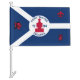 Car Flag with flag of city of Fort Wayne, Indiana; blue and white flag and with red blockhouse in the center and three illustrations in the blue field - illustration of Native American’s head, French fleur-de-lys and British lion