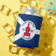 Can cooler with flag of city of Fort Wayne, Indiana; blue and white flag and with red blockhouse in the center and three illustrations in the blue field - illustration of Native American’s head, French fleur-de-lys and British lion