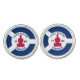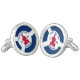 Cufflinks with flag of city of Fort Wayne, Indiana; blue and white flag and with red blockhouse in the center and three illustrations in the blue field - illustration of Native American’s head, French fleur-de-lys and British lion