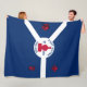 Fleece Blanket with flag of city of Fort Wayne, Indiana; blue and white flag and with red blockhouse in the center and three illustrations in the blue field - illustration of Native American’s head, French fleur-de-lys and British lion
