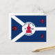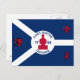 Postcard with flag of city of Fort Wayne, Indiana; blue and white flag and with red blockhouse in the center and three illustrations in the blue field - illustration of Native American’s head, French fleur-de-lys and British lion