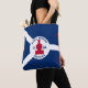 Tote bag with flag of city of Fort Wayne, Indiana; blue and white flag and with red blockhouse in the center and three illustrations in the blue field - illustration of Native American’s head, French fleur-de-lys and British lion