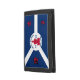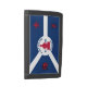 Wallet with flag of city of Fort Wayne, Indiana; blue and white flag and with red blockhouse in the center and three illustrations in the blue field - illustration of Native American’s head, French fleur-de-lys and British lion
