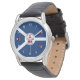 Watch with flag of city of Fort Wayne, Indiana; blue and white flag and with red blockhouse in the center and three illustrations in the blue field - illustration of Native American’s head, French fleur-de-lys and British lion