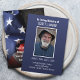 Blue funeral memorial prayer card with your favorite photo in frame. Modern typography is used. On the back of the card is additional text that can be customized overlaying USA flag.