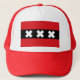 Hat with design with design with flag of Amsterdam, capital city of Netherlands, red and black flag with three white Saint Andrew’s crosses in the center