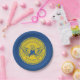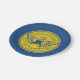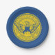 Paper Plate with flag of city of Atlanta, Georgia; blue flag with yellow seal with an illustration of phoenix rising from flames