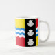 Mug with a flag of historic county of Bedfordshire, in England, Great Britain; red and gold flag with black vertical band with tree white scallops in the center