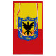 Paper bag with design with flag of Bogota, capital city of Colombia, red and yellow flag with coat of arms with eagle in the center