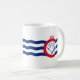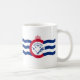 Mug with flag of city of Cincinnati, Ohio; white flag with three blue waves with red “C” in the center