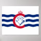 Poster with flag of city of Cincinnati, Ohio; white flag with three blue waves with red “C” in the center