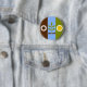 Round Button with flag of Fresno, California; flag with three vertical bands of brown, blue and green, with stylized illustrations of cog, plant and sun