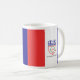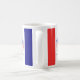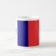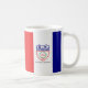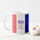 Mug with flag of city of Cleveland, Ohio; flag with three vertical bands of red, white and blue with seal of the city in the center