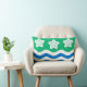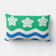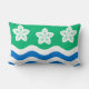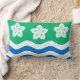Throw pillow with design with a flag of historic county of Cumberland, in England, Great Britain; green flag with three Parnassus flowers and white and blue waves