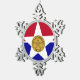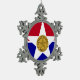 Snowflake Ornament with flag of city of Dallas, Texas; flag with red and blue horizontal bands with seal of the city inside of a white star in the center