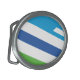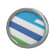 Belt Buckle with a design with a design with the flag of Dayton, Ohio. A green, blue, and white flag